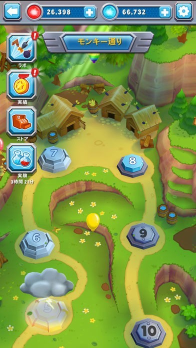 モンキータウンに現れる風船をただひたすら割っていくゲームですが、レベルが上がるほどに大量の風船が街に降り注ぎます。風船を一掃する爽快感が魅力のスクロール型ゲームです。