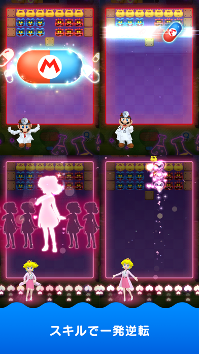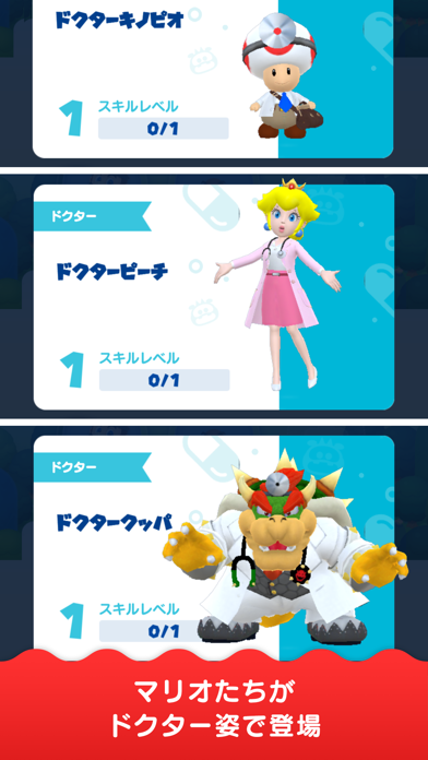 マリオだけでなく、ピーチ姫やクッパたちもドクター姿で登場。クリボー、ノコノコ、メットなどおなじみのキャラたちもウイルス退治をサポートします。
