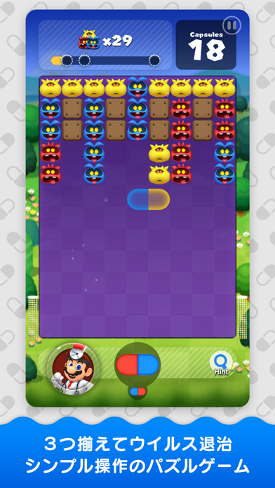 プカプカ浮いてくる赤、青、黄色のカプセルを操作。同じ色をタテ・ヨコ3つ揃えてウイルスを消すシンプルなパズルゲームです。