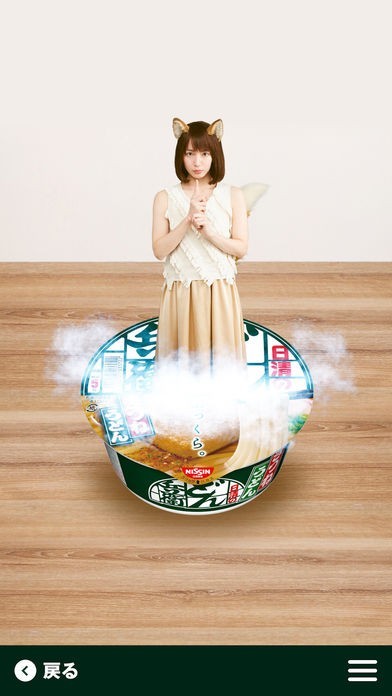 このアプリを起動して対象製品のカップ麺にスマホをかざすことで、吉岡里帆さんが扮する可愛らしい「どんぎつね」や星野源さんが、カップ麺上部のパッケージの上にCMのように現れます。