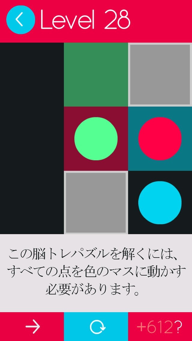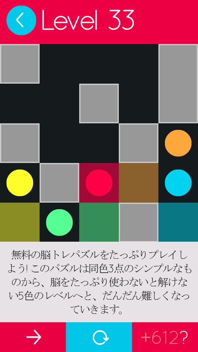 ●と同じ色のマスに入れるのが目的のゲームです。●にはある法則があるのでちゃんと計算しないとクリアできないようにできています。ルールは凄く単純なのでとりあえず説明を読まなくても直感的にできるようになっているのですぐに理解できると思います。シンプルだけれどステージが進むにつれて頭をかなり使わないと解けないようになっています。その分解けた時の爽快感はすごく気持ちいいです。短時間でもやれるようになっているので電車の中でとか空き時間の暇つぶしになります。100ステージ用意してあり全部クリアするにはかなり骨を折るので長く遊べるようになっています。