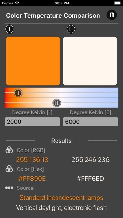 App Storeより引用Color Temperature Comparison Tool compare 2 difference color temperature on the fly. By input the color temperature value [Kelvin], color are show with color value in RGB and HEX, also indicate the color source for selected color temperature.