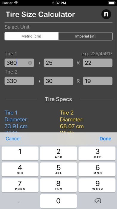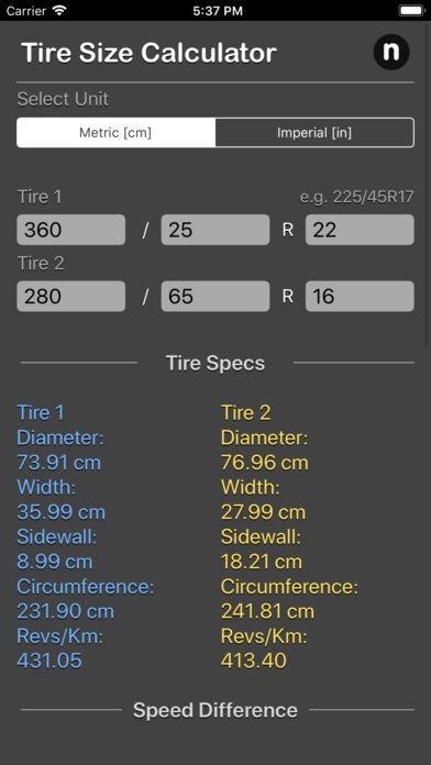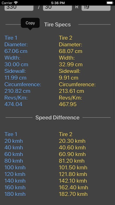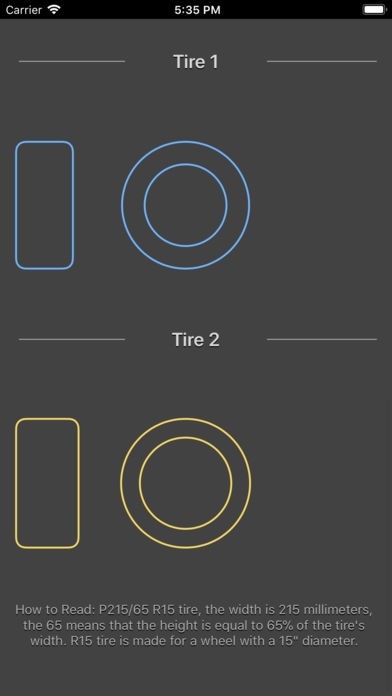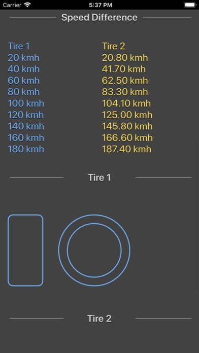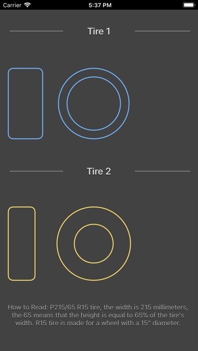 App Storeより引用シンプルなタイヤサイズの比較。タイヤサイズの計算は、直径、幅、側壁、周囲とマイルあたりの売上高を比較することができます。