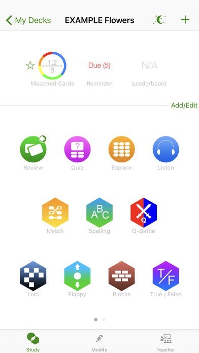 Matching, True/False, Memory, Spelling, Q-Battle, Word Search, Flow, Flappy Dog, Dig It Up, 2048, Ninja, Bingo, Q-Battle LMP, Blocks, and Letters games add more fun to your studying. Don't be surprised to find yourself playing games, getting badges and beating highscores of your friends or classmates rather than simply flipping cards... :) Not enough? Loci will turn your cards into a 3D Memory Palace that exploits a memory technique of ancient Greeks and memory champions. Moreover you will immerse ing an augment reality realm in Defender game