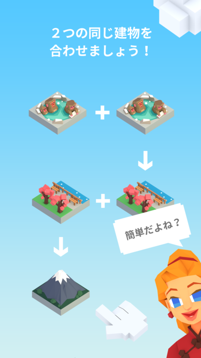 2つの異なる建物を組み合わせ、新たな建物を作成できます。組み合わせは数多くあるので、色々試して面白い建物を生み出してください。1人でゆっくり遊べるパズルゲームです。
