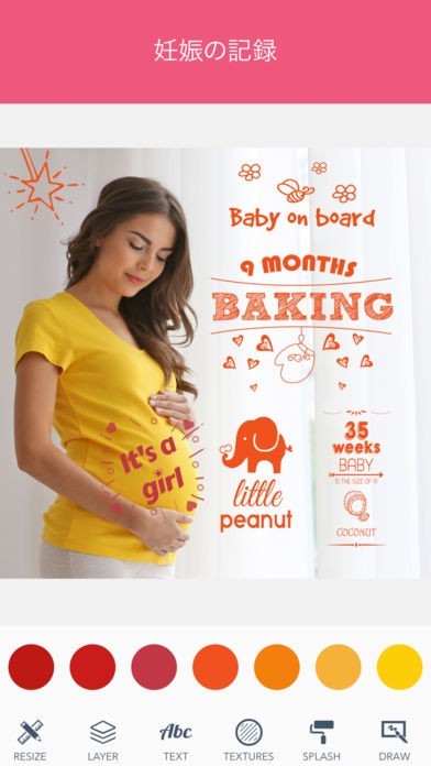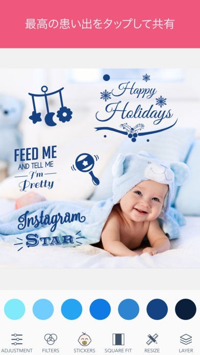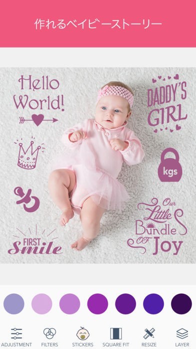 赤ちゃんやマタニティに関する写真をそのままSNSに投稿することはニュアンスが直接過ぎるという場合はアレンジしてみましょう。カラフルなデザインを使っておしゃれに加工できます。