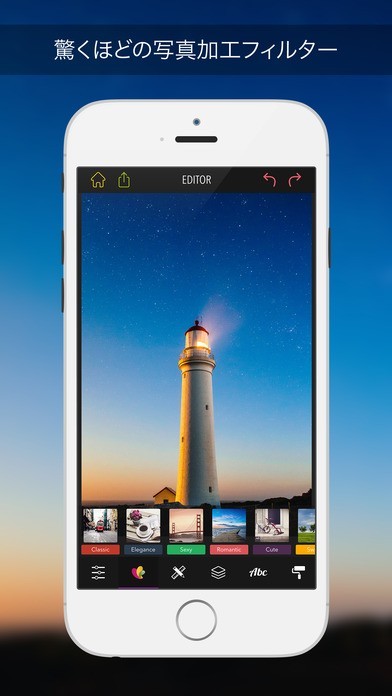 App Storeより引用PicPocとは、最高のフォトエディター。フィルターや編集機能によって、プロの写真家ですら、なかなか出来ないような写真が作れます。パワフルなエディターで素敵な写真に、そしてデザインツールによって秘められていたものを爆発させて、アートにしてしまいましょう。
