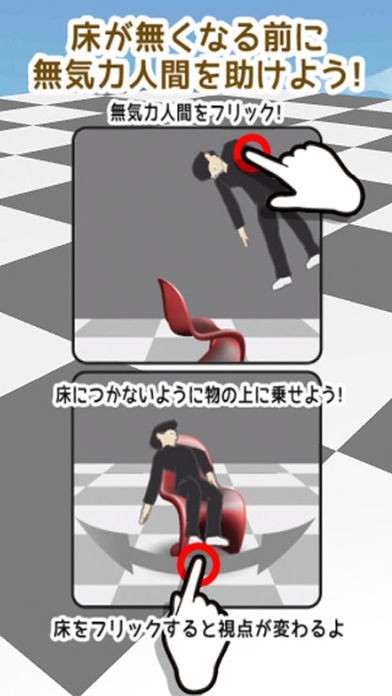 「無気力人間」は気楽に遊べるシンプルゲームアプリです。ゲーム開始とともに無くなっていく床から、だらりと寝転がったままの無気力人間を救出しましょう。やる気皆無な無気力人間は自力では助かろうとせず、プレイヤーが物体の上に乗せてあげる必要があります。無気力人間を乗せるためのオブジェクトとしては、ソファ、椅子、彫像など用意されており、上手にオブジェクトの上でに乗せることによって、ハイスコアを狙うこともできます。プレイに必要なのはフリックのみと、簡単操作も嬉しいポイントです!