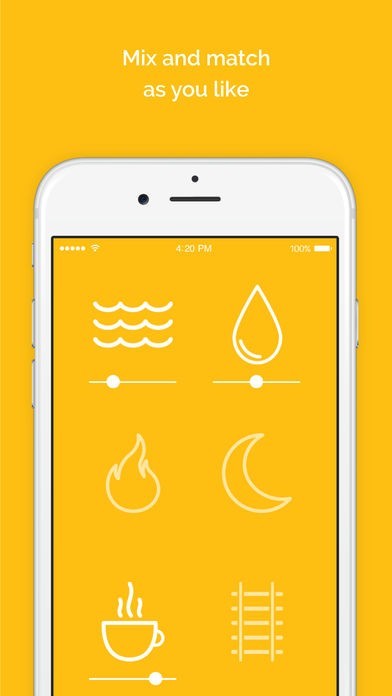アプリを起動すると環境音を表現したアイコンが表示され、サウンドを再生すると背景の色が変化し癒し効果をさらに高めてくれます。全16種類のサウンドを存分に味わって満喫しましょう。