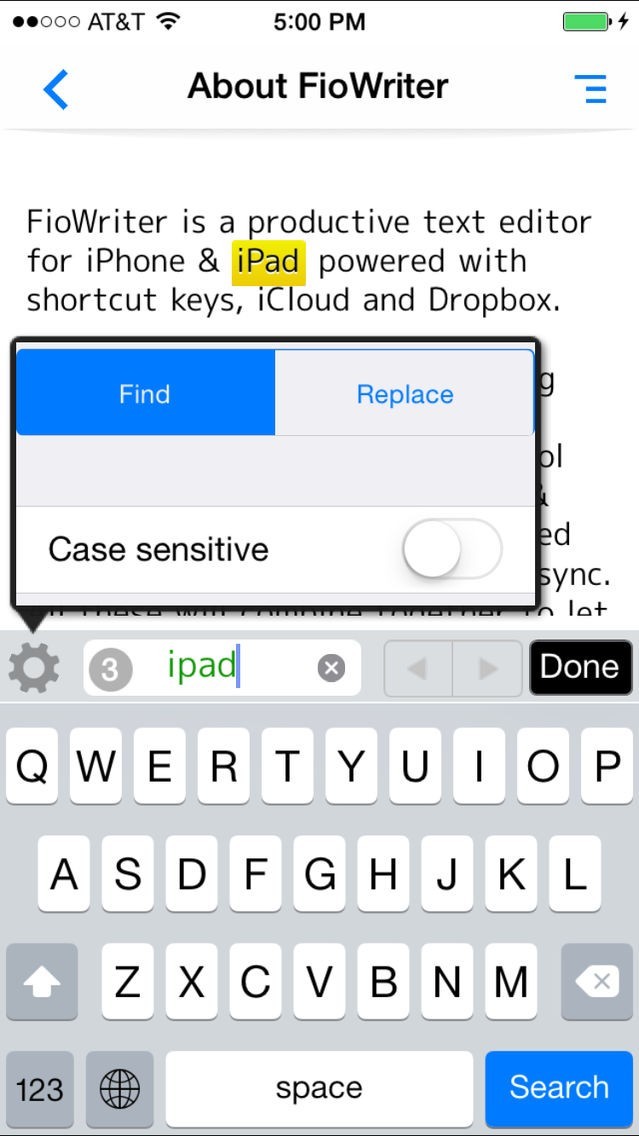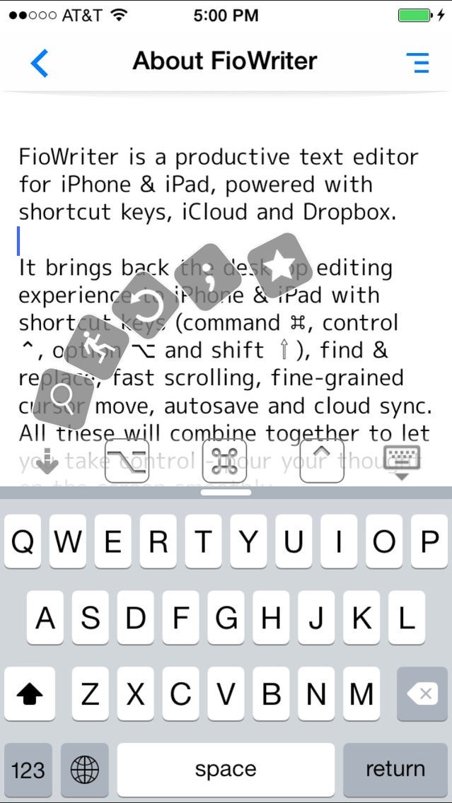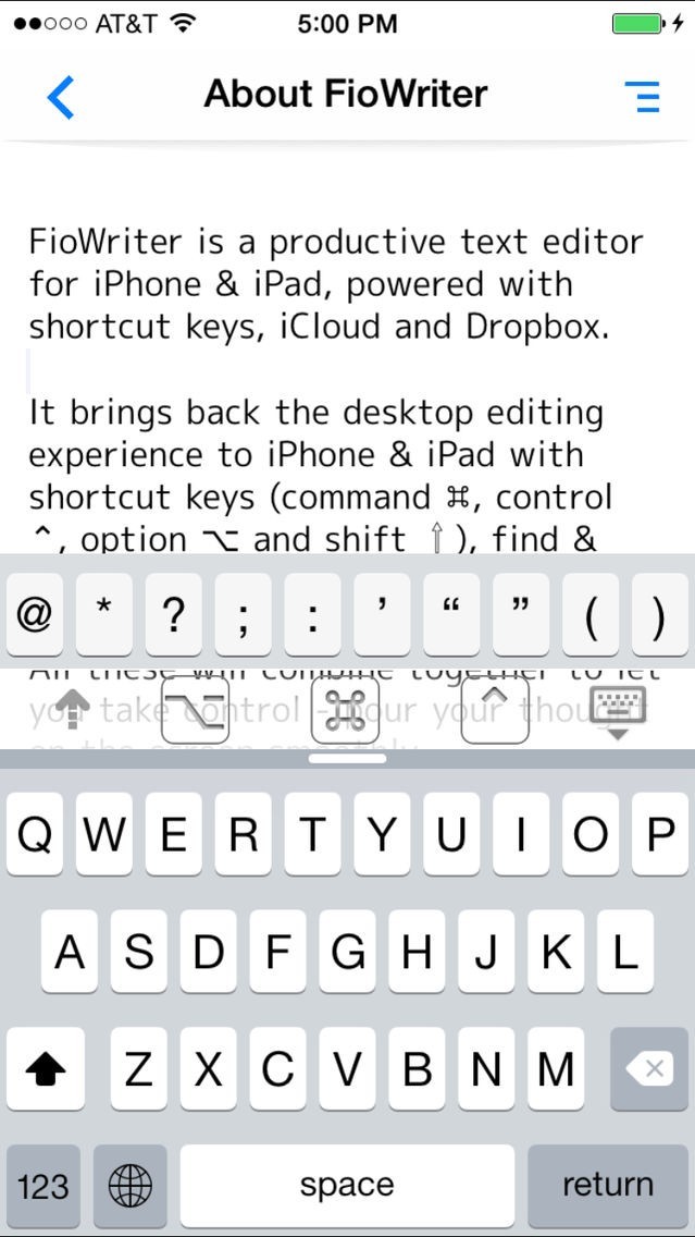 FioWriter is a productive text editor for iPhone & iPad, powered with shortcut keys (⌘ ⌥ ⌃ ⇧), iCloud and Dropbox.