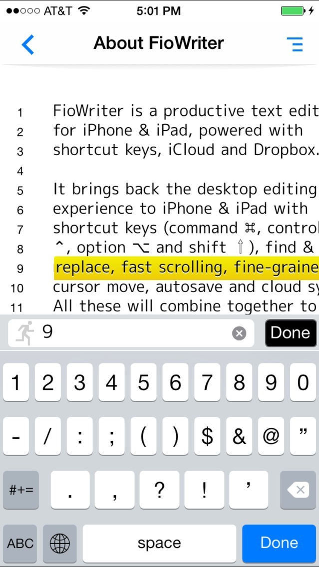 It brings back the desktop editing experience to iPhone & iPad with shortcut keys (command ⌘, control ⌃, option ⌥ and shift ⇧), find & replace, fast scrolling, fine-grained cursor move, autosave and cloud sync. All these will combine together to let you take control - pour your thought on the screen smoothly.