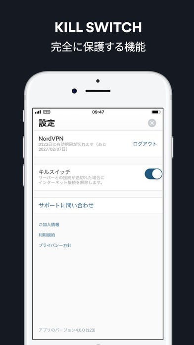 キルスイッチ機能が搭載されています。突然サーバーとの接続が途切れてしまった場合など安全な接続が確保できていないと判断された場合には一度接続が自動的に遮断されます。