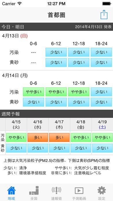 PM2.5と黄砂の予測 大気汚染予報とは、九州大学応用力研究所が制作した『SPRINTARS』の予測により、日本の北〜南までの地域の気象情報などを、読みやすい天気予報風にアレンジを加え、詳しく紹介してくれるアプリの事です。上記以外にも、環境省が発表している『そらまめ君』の気象データなどを、細かくチェックする事も可能です。情報を集めて行く方式へと、方法を新たに付け加える事で、バッテリー持ちやデータの送受信量を、上手くカットしております。