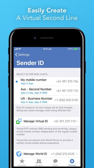 Effortlessly rent a new local or international number in World Phone with Virtual and World IDs. It's a second phone in your phone! Use these numbers for business, travel or family in foreign countries. Available in 19 countries.