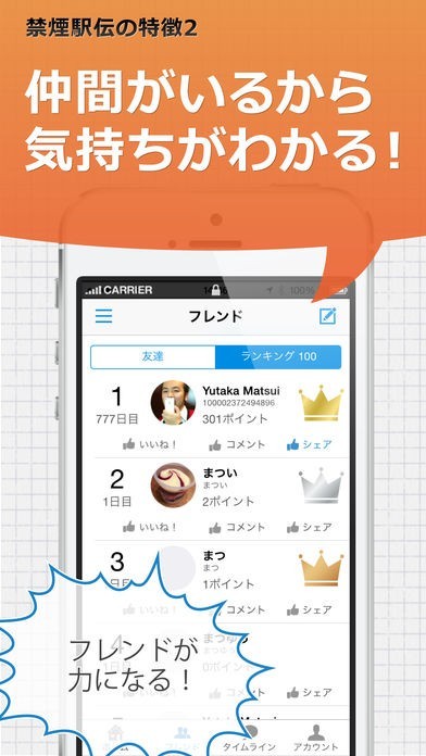 ランキング機能で友人の禁煙の状況が分かる