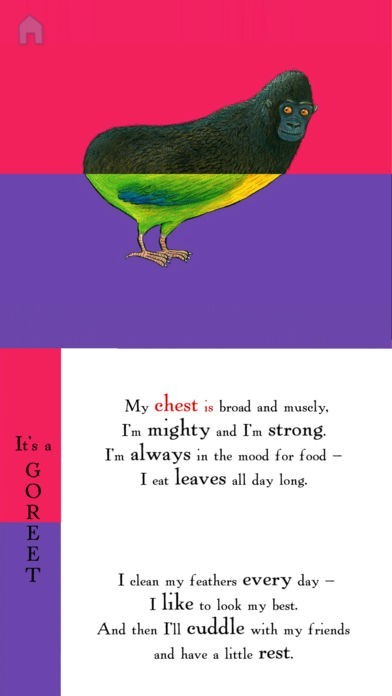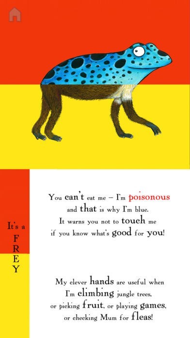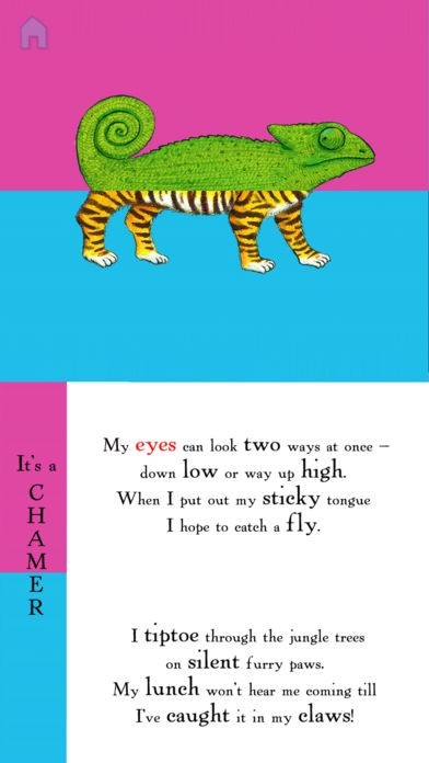 Swipe any part of the screen to create new animals and hear the poem read aloud, with original sound effects, jungle music, and text highlighting.