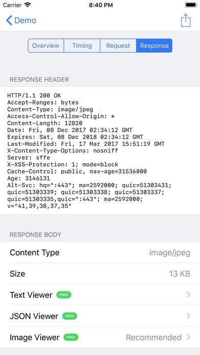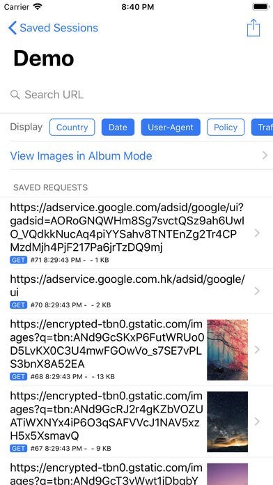 * Record and display HTTP request and response sent from your iOS devices, including body and header;