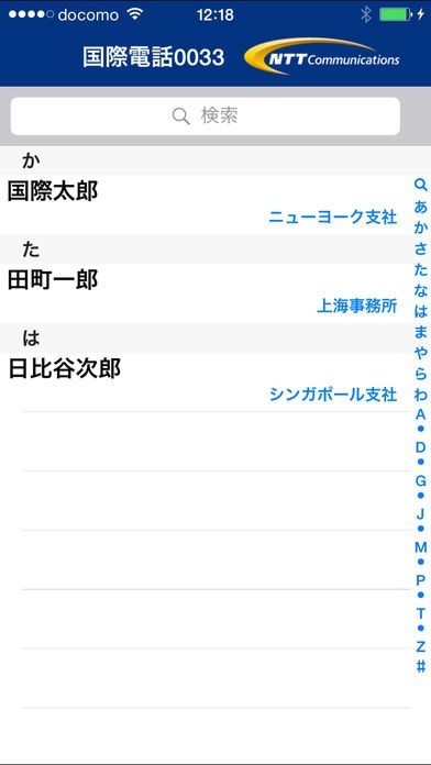 ・国際電話0033アプリは、起動時に標準の”連絡先”アプリより海外の相手先を抽出し、”国際電話0033”一覧画面に氏名、会社を表示します。