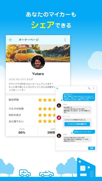 特に個人間での貸出で問題になるのが、車のオーナー・ドライバー間のやりとりです。本アプリでは双方のコミュニケーションのためのチャット機能が搭載されているため、スムーズにやりとりが可能です。