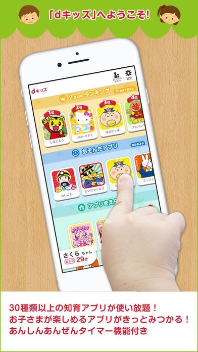 「dキッズ」は、0歳から12歳までを対象とした知育ゲームをスマートフォンを使ってプレイすることができるアプリになります。30種類1500コンテンツが収録されているので飽きることなく遊ぶことができるようになっていて、時間制限タイマー機能で子供が遊びすぎないように時間を設定しておくことが可能となります。