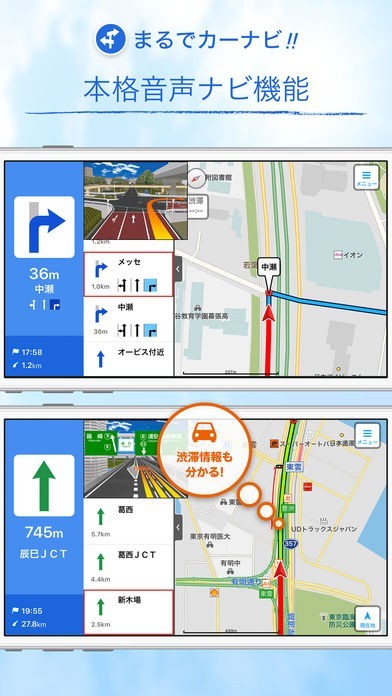 地図を読むのが苦手な方の中には、自分の現在地がアプリ上で分かっても、そこからどの向きに歩き出せばいいのかが分からないという方も少なくないのではないでしょうか。そのような場合でも、アプリ「地図アプリ -ナビ・乗換が便利なおでかけマップアプリ-」には、ルート案内の際ただ単純に地図上に道筋を表示させるだけではなく、まずどの方向に進めばいいのかが分かる「一歩目案内」の機能があるの、知らない場所でも安心して移動することができます。また、ドライブ時のカーナビ代わりとしても利用することができ、交通渋滞を考慮した最適なルート選択や、音声案内も可能です。