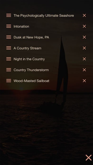 • Sounds include ocean waves, birdsongs and dawn chorus, chimes, "be-in", thunderstorms, gentle rain, heartbeat, wind in trees, wordless choir, summer cornfield, creaky sailboat, country stream, country meadow, blizzard, and many more.
