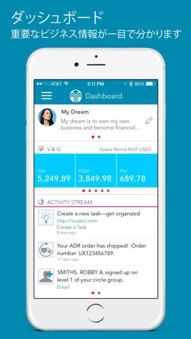 このアプリではV&Gを活用して、組織内のアクティビティを確認することができます。サークルグループ、エグゼクティブ ブレイクアウェイ、最新のコミッション状況、注文やGPS報告を確認することが可能です。