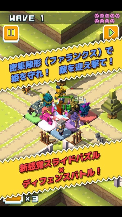 3×3マスの9マスの中で姫を守りながら戦い抜くゲームとなっています。敵の種類やが来る方向を見極めて適切に配置していきましょう。姫は守られるだけでなく回復能力を持っているので戦っているユニットの隣に配置できればベストです。