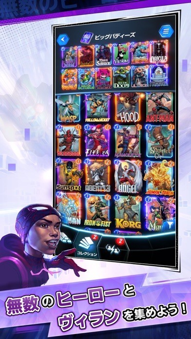 アイアンマン、スパイダーマン、ハルク、キャプテン・アメリカ、ロキ、マイティ・ソーなど「マーベル・ユニバース」のヒーローやヴィランのヴァリアントを収集し、君だけの最強のデッキを創造しよう。懐かしいコミック版のビジュアルから、ちびキャラ版、カートゥーン版まで、多彩なアートワークを楽しめる。君だけのコレクションを作って自慢しよう!