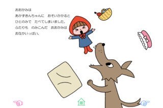 文章は中川ひろたかさんが電子絵本のためだけに書き下ろし! さらに、長谷川直子さんのかわいいイラストがお話に花を咲かせます。大きな目が印象的なあかずきんちゃん、お花を摘んだり、石を集めたり、愛くるしい表情を見せてくれます。おおかみがおばあちゃんやあかずきんに襲いかかるシーンは少しビックリするかもしれません。