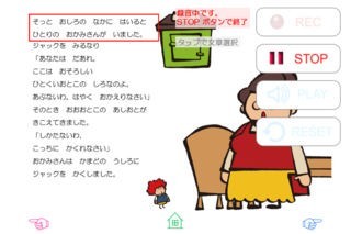 セリフを段落ごとに録音し、その音声でお話を再生することができます。