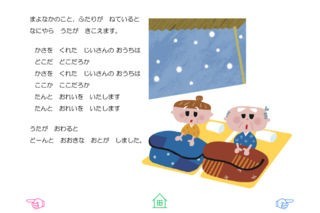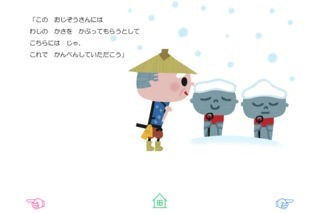 文章は中川ひろたかさんが電子絵本のためだけに書き下ろし! さらに、かいちとおるさんの、おだやかで、優しいキャラクターにも注目です!おじいさんやおばあさん、おじぞうさんの優しい表情がやわらかいタッチのイラストで表現されています。とうとうと降り積もる雪の中、おばあさんが編んだかさをおじぞうさんに被せてあげたおじいさんたちの元に現れたのは…。