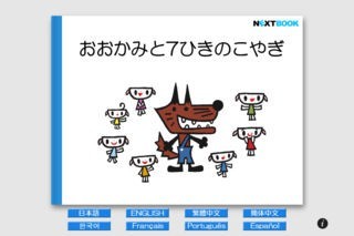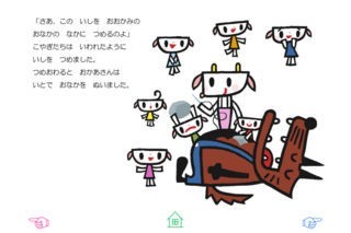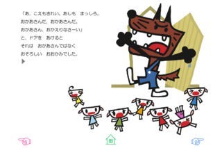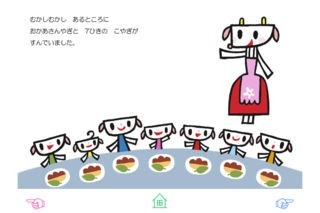 文章は中川ひろたかさんが電子絵本のためだけに書き下ろし! さらに、博多哲也さんが描く、個性豊かなキャラクターたちにも注目です!ドアの前でおかあさんの帰りをまつ7ひきの子やぎとこやぎをねらうおおかみ。おおかみがドアを開けてかわいいこやぎたちに襲いかかるシーンは少しビックリ。