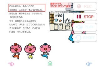 セリフを段落ごとに録音し、その音声でお話を再生することができます。