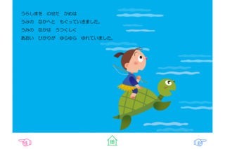 文章は中川ひろたかさんが電子絵本のためだけに書き下ろし! さらに、さいとうまりさんのかわいらしいイラストがおはなしを元気いっぱい盛り上げます。いじめられているカメを助けて、連れられていった先はかわいい魚と綺麗な女の人が待つ竜宮城。竜宮城で天国のような暮らしをしていたうらしまたろうがふるさとに帰ると…。