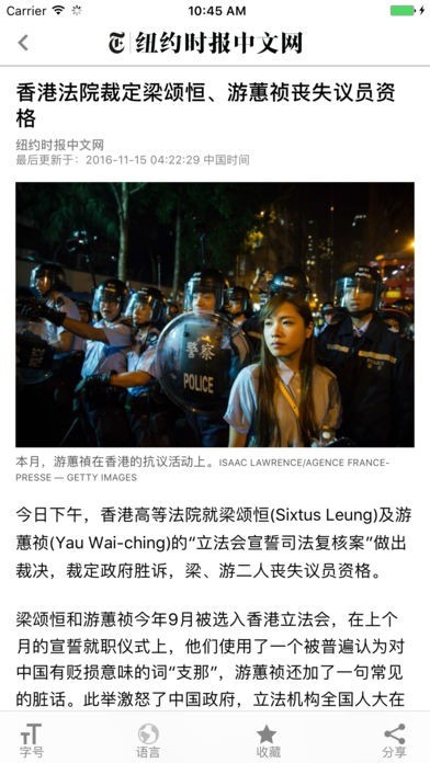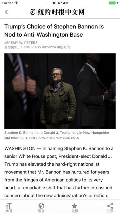 App Storeより引用纽约时报中文网(cn.NYTimes.com) 是纽约时报公司旗下的首个中文媒体产品,旨在向读者提供全球时事、商业及文化生活领域的高水准报道。网站内容特为中国读者量身打造,既包括《纽约时报》英文报道的中译版本,也包括本土作者专为中文网所撰写的原创内容。