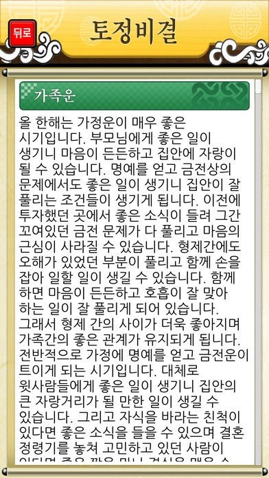 가족운, 직업운, 사랑운, 금전운, 건강운 및 각 월의 점괘를 보여줍니다.