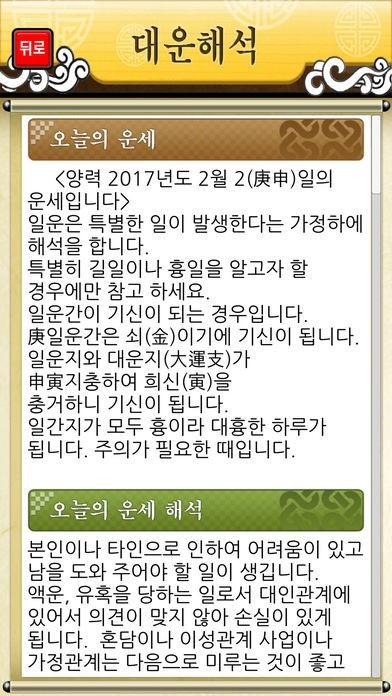 오늘의 운세, 한달간 운세, 일년간 운세, 십년간 운세를 보여줍니다.
