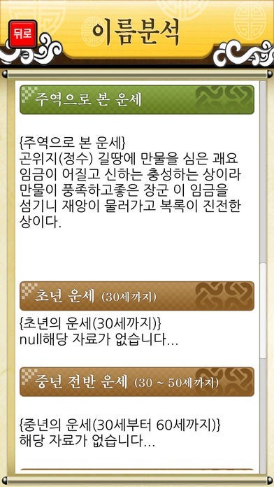 연애운, 자식운, 재산운, 직업운, 건강운, 수명운을 보여줍니다.