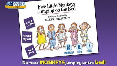 Join the Five Little Monkeys in this interactive book app as they jump on the bed after they say good night to Mama! Explore pictures, learn new vocabulary, and personalize the story with your own narration. Jump inside to find out what trouble the Monkeys get into as they jump on the bed!