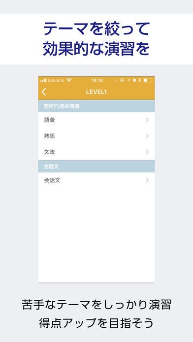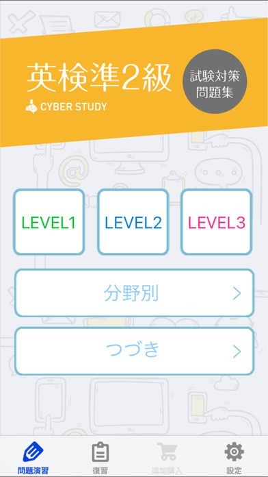 LEVEL1~3の3段階の難易度から選んで問題を解くことができるので、簡単な問題から徐々にレベルを上げて勉強できます。難易度ごとに分野を絞って出題することもできます。
