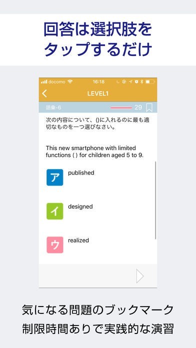 苦手な問題は画面右上にあるしおりマークをタップすれば、チェック機能で登録することができます。しおりを付けた問題だけを出題することができるので、効率的に復習できます。