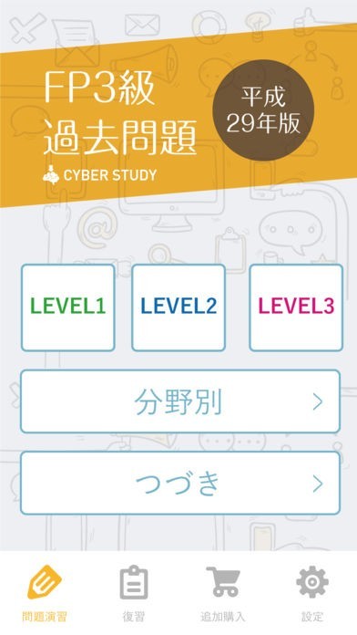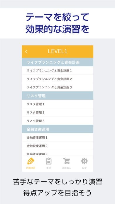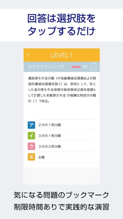 2018年度のFP3級合格を目指すアプリです。全ての問題に分かりやすい解説が付き、不正解だった問題やチェックした問題に絞って出題する苦手克服機能で、効率よく学習することができます。