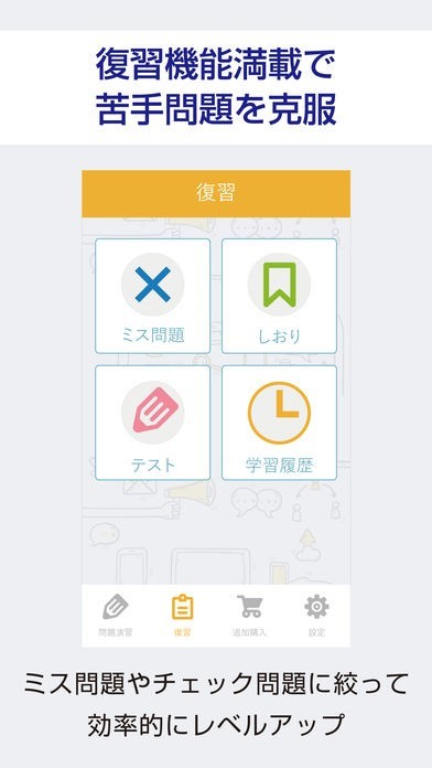 全ての問題をレベル別、分野別に演習できるので、自分の苦手分野や合格率に合わせて学習を進めることができます。演習は前回の続きから始めることができるので、自分のペースで学習が可能です。