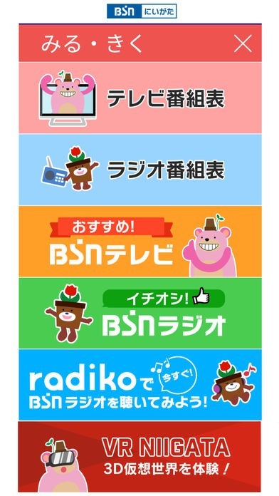 アプリのトップ画面から視聴者・リスナーのみなさんとBSN新潟放送がつながる「知る」「みる・きく」「つながる」「もっとBSN」のカテゴリーにわけて、新潟のニュースや天気、番組情報などにも簡単にアクセス。みなさんから動画やメッセージの投稿、プレゼント応募も簡単に行っていただけます。