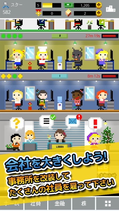 カンパニーで働く社員にはステータスや誠実、活動的といった属性がそれぞれ決められています。そして仕事を任せるフロアにはおすすめの属性が決められているので、それぞれの人にあったフロアに配置していきましょう。全員を得意な属性で揃えると効率が上がるだけでなく報酬が増えるなど数多くのボーナスがあります。全てのフロアにぴったり合う配置にするのは中々難しいですがそこが面白い部分です。そして会社を成長させていくと街作りに関わることができるようになります。社員寮やお店など社員のためになる建物をどんどん建築していきましょう。街の収益も会社の収益に関わってきます。上手に経営して最高の会社を目指しましょう。