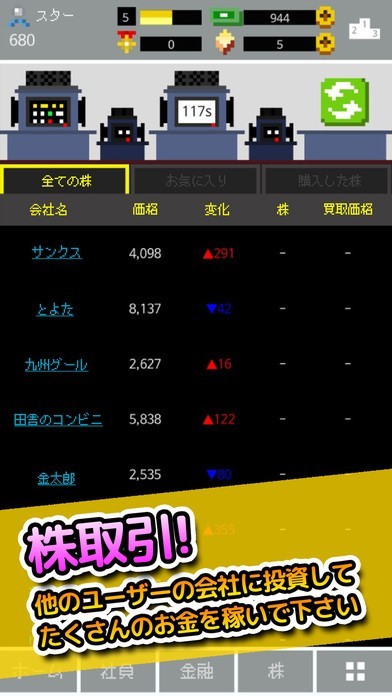 他ユーザーと株取引をし、借金もできる。株価を引き上げて世界100位を目指せ
