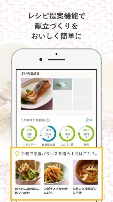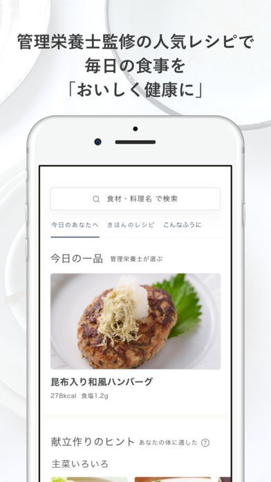 7000以上の人気で定番のレシピを管理栄養士が監修しているので、毎日の献立の健康バランスを考えるのに役に立ちます。 栄養バランスはもちろん、手軽で簡単に作れる主婦目線で選んだレシピばかりです。 プロフィールを登録することで、ユーザーに合ったレシピや献立を提案する嬉しい機能を搭載しています。 食欲がない、作り置きなどの気分からレシピを検索することも可能なので、本当に食べたい料理を作ることができます。
