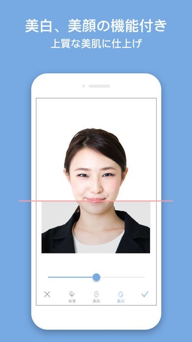 証明写真BOX Proはスマホだけで誰でもキレイな証明写真を撮ることが出来ます。簡単操作で顔を自動的に認識し、美肌効果を行い、背景色も選択でき簡単に証明写真をスマホで撮ることができます。