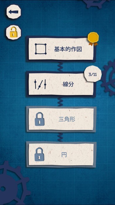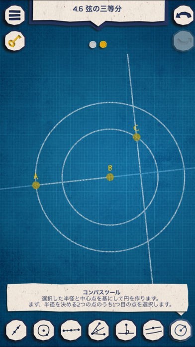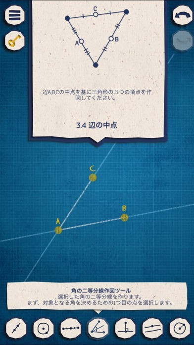 全てのレベルは「基本的な作図」、「線分」、「三角形」、「円」という4つのカテゴリーに分けられています。最初のいくつかのレベルをクリアすることで、新しい作図ツールを見つけることができます。それらのツールを使うことで、難しいレベルをより簡単にクリアすることができます。